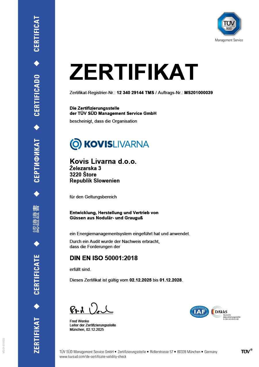 Kovis Livarna weist eine lange Tradition in der Bereitstellung von Produkten und Prozessen höchster Qualität vor. Diese Richtlinien belegen auch die Zertifikate für Qualitäts- und Umweltstandards. ISO 9001 wurde 1999 erworben.