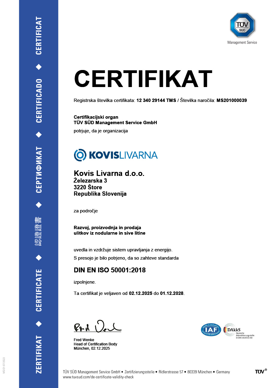 Kovis livarna ima dolgoletno tradicijo pri zagotavljanju najvišje kakovosti izdelkov in procesov. Te usmeritve dokazujejo tudi certifikati standardov kakovosti in okolja. ISO 9001 smo pridobili že leta 1999.